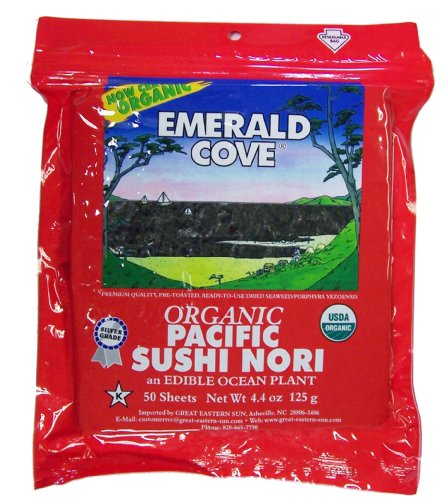 Of the scores of kinds of seaweeds consumed around the world, nori is the overwhelming favorite. Although originally gathered wild, nori has been cultivated in Japan since with 1700's and today more than 300,000 tons of fresh nori are harvested annually from farms in coastal Japan, Korea, and North China. nets of woven rope are suspended below the surface of the ocean in quiet bays, and during the cold months of winter, the nori slowly grows to cover the entire net. From December to February, the nori is hand-harvested, washed, and placed in frames to dry into paper-like sheets. This low-temperature, slow drying is essential to retain the nutrients. Emerald Cover Organic Pacific Sushi Nori is guaranteed Silver Grade, the highest grade for everyday use in Japan and the highest grade available in the North America natural food industry. The fine texture and pliable sheets produce exceptionally smooth and delicious rolls of nori-maki sushi. Each sheet is pre-toasted to a beautiful, brilliant golden-green. You'll marvel at the clean, sweet taste of this king of edible sea vegetables.